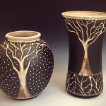 Her designs are drawn onto a variety of pots she makes using glaze. Many are patterns or trees which add a bit of whimsy to the warm, textural clay body, which is left exposed as a backdrop for her designs. Some of her pottery and plates have fish, birds and other animal designs among the trees and patterns.